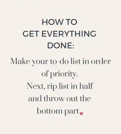 Než se budete trápit tím, jak říct ne někomu jinému, řekněte ne sami sobě. Řekněte ne přidání další věci do seznamu úkolů. Pokud je již příliš dlouhý, přepište jej podle priority, roztrhněte napůl a spodní polovinu vyhoďte. Někdy, když jsou naše seznamy příliš dlouhé, buď nás rozptyluje představa, že je toho příliš mnoho, nebo máme pocit, že nejsme dost dobří, protože toho nestíháme dost. Tento systém měření je nefunkční.